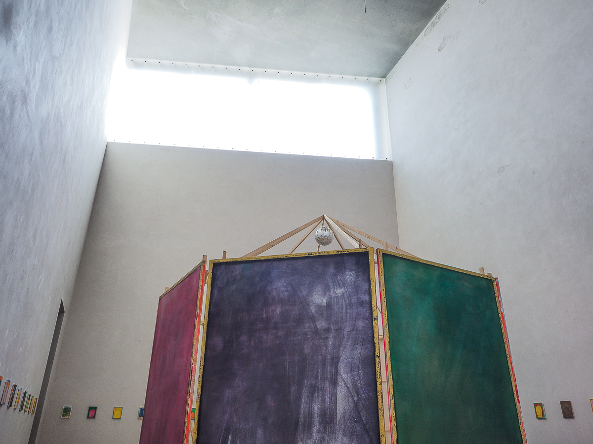 As a graduate of Dieter Krieg’s Master class Robert Klümpen is updating a particular position in art. He addresses the interface of painting where an image and its reproduction enter into a reciprocal relationship with each other and explores the difference between a depicted thing and its real counterpart. His exhibition gut und gern translates this conundrum into a monumental statement, at the same time affording us insight into the painter’s workshop, which resembles a kitchenette. Eight large-scale pictures and basic roof battens combine to form a simple carpentered framework with a stepped base that begs comparison with an enclosed children’s roundabout. As an octagon this art object made of art – entitled Cella – could refer to the architecture of sacred buildings or to a vessel, like the chapel of the Madonna in the Ruins, a free-standing font (baptistery) or perhaps to liturgical cups known as ciboria designed to hold consecrated wafers (examples are exhibited in Room 7). Yet these formal associative clues fade in the face of the stark reality of the framework’s stance in space. A peep through the gaps into the interior confirms that it is completely empty. The reverence expected in our visual perception of abstract colour painting since Mark Rothko’s generation is thwarted. The artistic concern is apparently directed at evoking a magical world of beautiful appearances, the enchanted mirror of reality offered at a fairground. A disco ball hanging in the apex of the delineated roof construction takes these words literally. Its multifaceted mirror reflects the numerous smaller-scale paintings hanging on the surrounding walls. In these, Klümpen has made varied use of his painterly medium with playful relish, nearly but not quite indulging in kitsch. He ignites a firework of visual effects, rendering familiar subjects, using a brush, crayon and spray paint. The apparently fleeting nature of these images contrasts with the air of virtuosity of his techniques. Abstract “bubbles” alternate with a few still lifes and portraits of some painters, including Paula Modersohn-Becker, Ferdinand Hodler and Ernst-Ludwig Kirchner. These small format pictures hung regularly at eye level generate a rhythm that pervades the room, while the dialogue about painting in relation to the pictorial merry-go-round gathers pace.