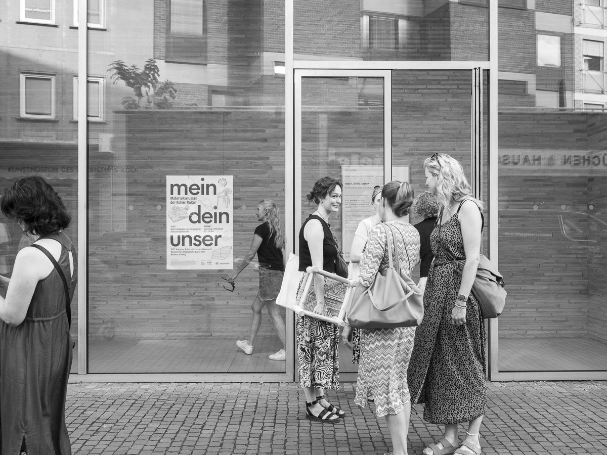 Wie wird aus Klimaschutz ein Mehr an Kreativität und Beisammensein? Dass Ressourcenschonen auch Spaß machen kann, will das Materialkarussell der Kölner Kultur zeigen, eine Initiative des Green Culture Collective Cologne (GCCC). Vier renommierte Kulturinstitutionen verwandeln sich in Orte des Austauschs und der Wiederverwertung: Kolumba / Kulturzentrum am Neumarkt / Museum für Angewandte Kunst / Museum Ludwig. Unter dem Motto »mein, dein, unser« können an den o.g. Orten vielfältige Materialien aus vergangenen Kulturproduktionen, die nicht mehr benötigt werden, mitgenommen werden: von Bilderrahmen über Kataloge bis hin zu Kostümen, Büromöbeln und Designobjekten. Das GCCC freut sich, wenn im Gegenzug ein frei wählbarer Geldbetrag in einer der vor Ort aufgestellten Boxen hinterlassen wird. Der gesammelte Betrag wird im Anschluss eins zu eins an ein ökologisches und ein soziales Projekt weitergegeben. An allen Orten finden über den Tag verteilt zudem Gespräche, Vorträge, Rundgänge oder Workshops statt, die das Thema vertiefen und auch danach fragen, wie Kulturarbeit auch inhaltlich nachhaltig werden kann. Zum gemeinsamen Abschluss des Events lädt das Museum für Angewandte Kunst Köln um 18 Uhr zum Get-together bei Musik und Getränken in seinen Innenhof ein.